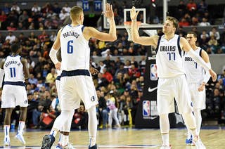Dallas Mavericks teammates Luka Doncic and Kristaps Porzingis tried to recreate the shot during Thursday's game against the Detroit Pistons in Mexico City.