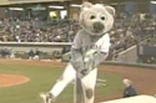 Furry Bear Mascot Falls Into a Dugout