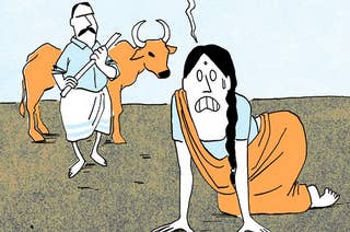 The cartoon, which originally appeared in French magazine Causette in Jan. 2013, shows the phrase "India, the land of sacred cows" struck out and replaced by "India, the land of massacred women."