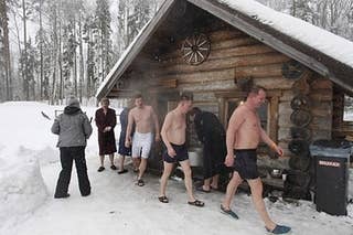 Six hundred people in Otepaa, Estonia, got together on Sunday to race from sauna to sauna in below-freezing temperatures. [WARNING: a photo of two butts and some photos of very pasty looking people in bathing suits.]