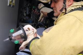 Oh my god, they're using tiny gas masks. Don't worry, neither of the puppies were injured!