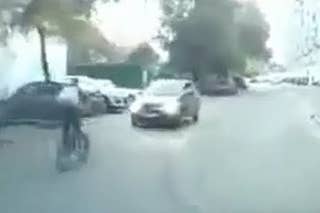 A bicyclist travelling on the road tried to jump over a car that was heading towards him.