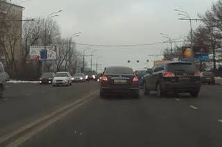 The men behind the wheels of the Nissan Teana sedan and the Mazda CX-9 crossover were trying to intimidate each other in a stupid game of chicken on the road by swerving left and right. It didn't take long before their game almost turned deadly for two pedestrians who were trying to cross the street. Luckily, the two women avoided being hit by the cars literally the last moment.
