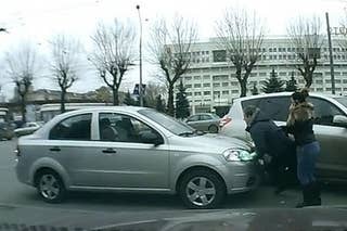 A woman standing in the middle of the road, falling down by herself and then, as soon as the car leaves, getting up all by herself... Another one insurance scam attempt.