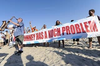 "Romney Has A Koch Problem," MoveOn banner says. A donor gives the finger.